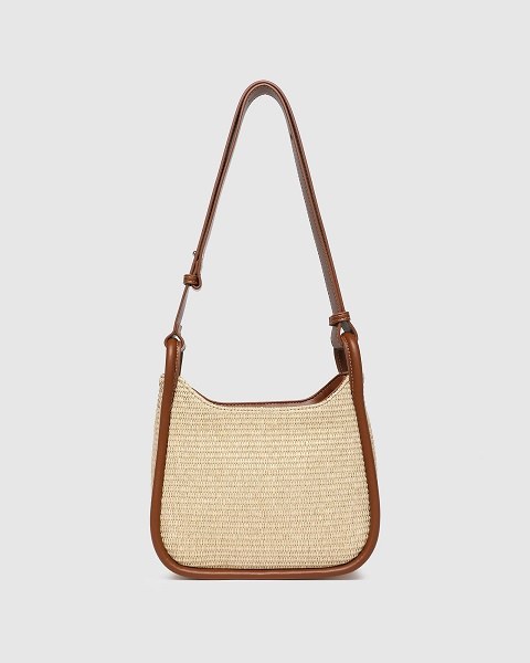1ct; Clare raffia shoulder purse; cream/tan Designed in Australia