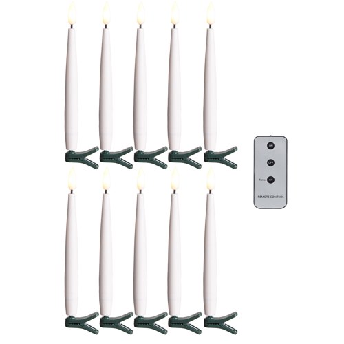 10ct; remote included; 6in clip on lighted candles for trees, garlands requires 1-AAA battery to each candle (not included)